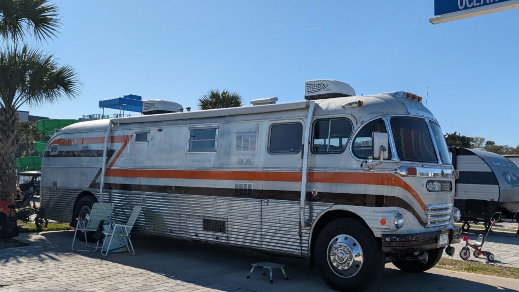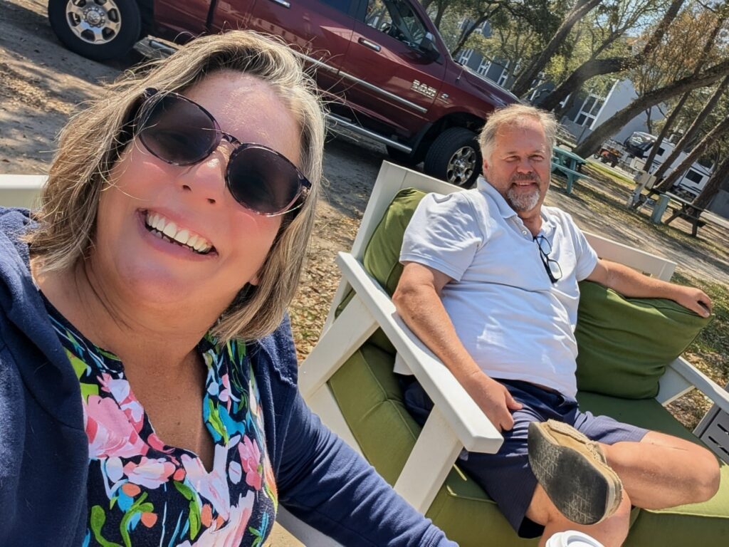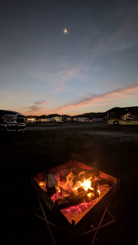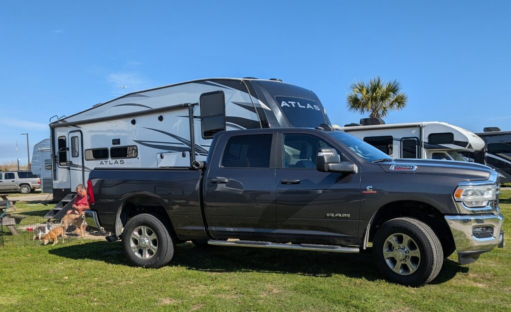 Ron put the truck in reverse at 15:33 p. m, according to my watch. After several back-and-forths and the neighbor moving his jeep, we unhooked from site 5603 at Lakewood Camping Resort. Located three spots from the beach, the ocean breeze cooled our sun-warmed skin as we enjoyed our post-setup drink.